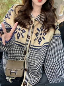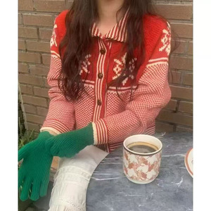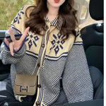 费尔岛翻领毛衣外套女秋冬款软糯复古雪花针织衫秋冬款单排扣开衫