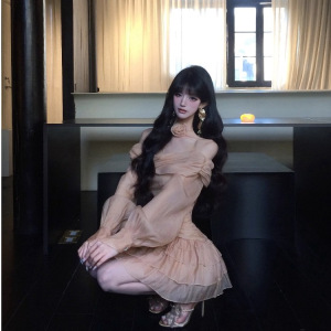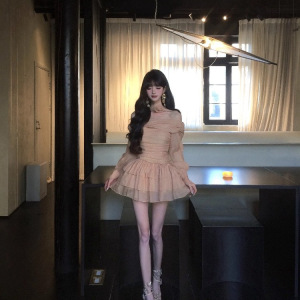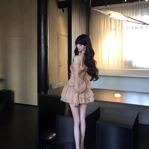 2025新款秋冬多层荷叶边蛋糕裙收腰显瘦一字肩连衣裙蓬蓬公主裙潮