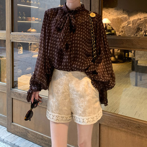JUEMEI 钟灵复古自制印花衬衫上衣女秋季法式飘带减龄洋气2025新