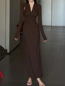 早秋季长袖扭结领连衣裙子女收腰法式感长裙