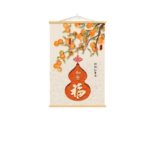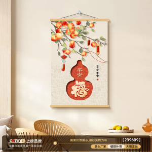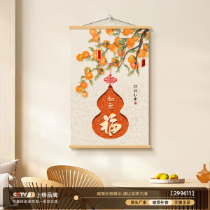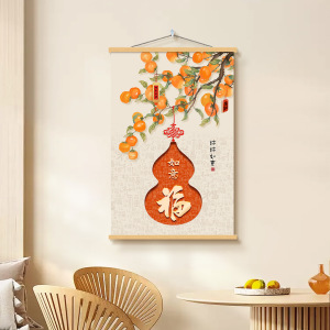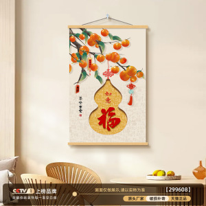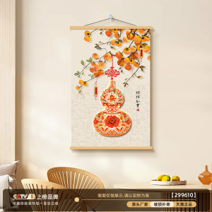 中国风挂毯墙面挂画免打孔餐厅柿柿如意装饰画直播间实木卷轴挂布