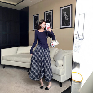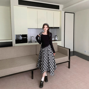 2025秋季新款胖mm大码女优雅蝴蝶结上衣+不规则格子半身裙套装