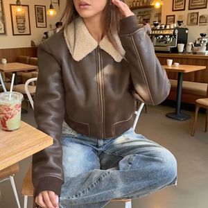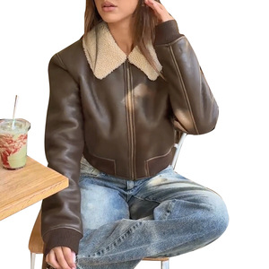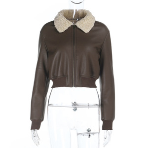 JY25441 欧美秋冬新款棕色设计感小众羊羔毛PU皮外套保暖防风上衣
