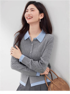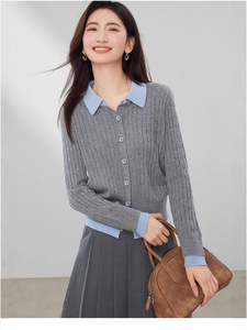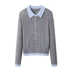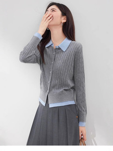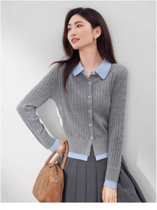 朗文**女装坑条纹针织开衫女2025秋季新款简约通勤假两件拼接上衣