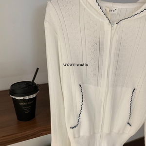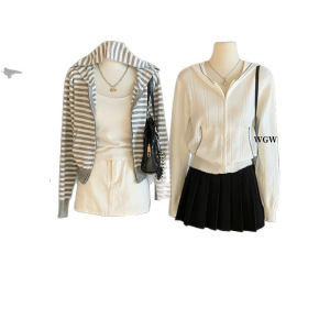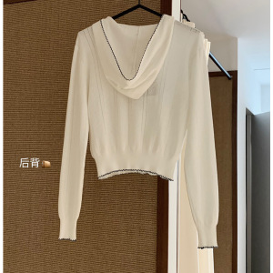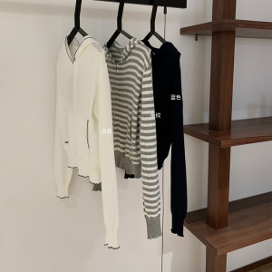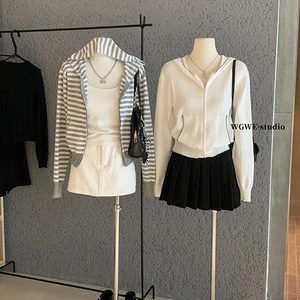 WGWE6907条纹连帽长袖针织衫外套韩系显瘦短款开衫上衣