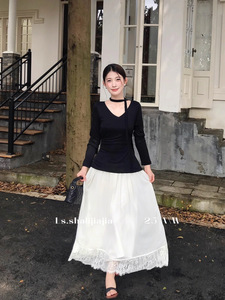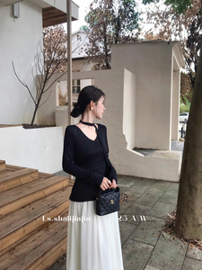 挂脖飘带T恤女欧货2025秋装新款纯欲风小众长袖显瘦纯色打底上衣