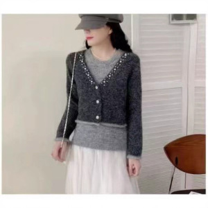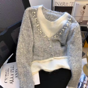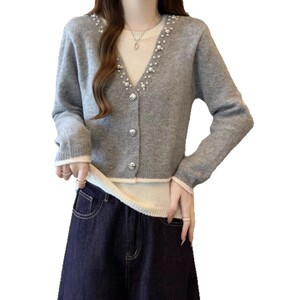秋冬新款韩版钉珠假两件针织开衫女软糯慵懒风设计感毛衣外套