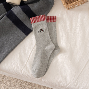 红格子翻边KT猫韩版可爱卡通刺绣蝴蝶结中筒袜子女春秋无骨潮袜