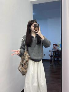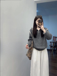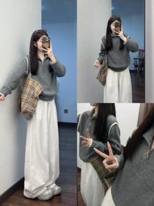 深秋初冬搭配一整套设计感短款半拉链高领拼接上衣高腰裤子两件套