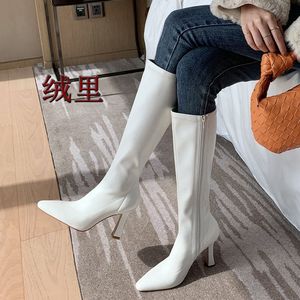2025秋冬新款尖头长筒靴女白色长靴细跟弹力靴子高跟瘦瘦靴不过膝