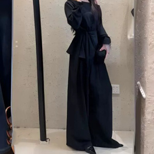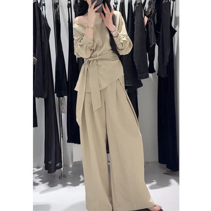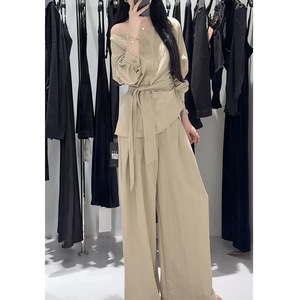 韩系气质老钱风套装女秋季新款复古系带斜领上衣高腰阔腿裤两件套