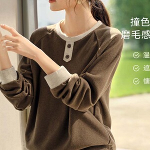 美拉德撞色拼接磨毛绒感卫衣女秋季新款宽松休闲运动上衣
