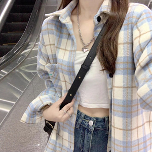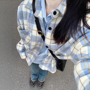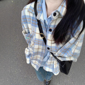 厚款毛尼料蓝色格子衬衫女装2025秋季新款港风chic长袖外套上衣女