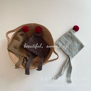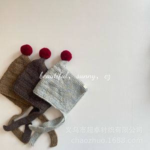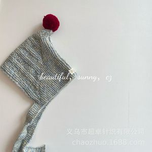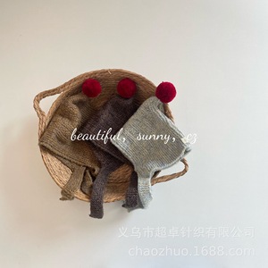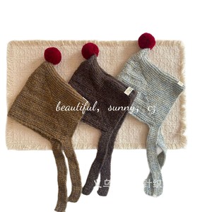 韩式冷色系毛线帽男童女童撞色球球方块针织帽护耳帽
