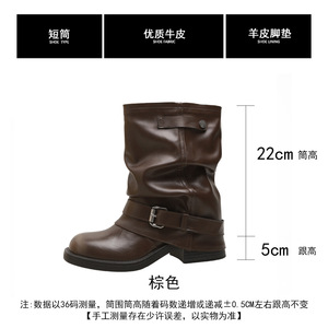 牛皮版葡萄妈同款辣妹裤管靴女时髦废土风褶皱扣带西部牛仔靴短靴