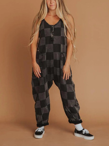 2025欧美风跨境女装独立站格纹印花休闲大口袋连体裤wish露背宽松