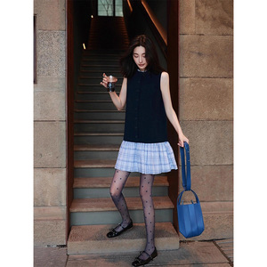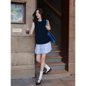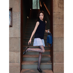 圆领法式格子少女风拼接针织无袖连衣裙气质设计感裙子女