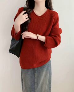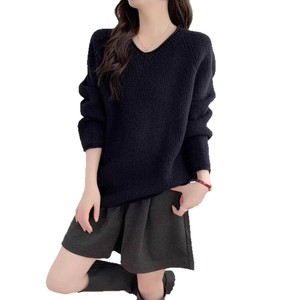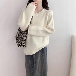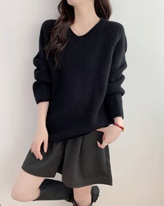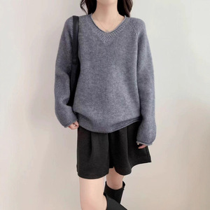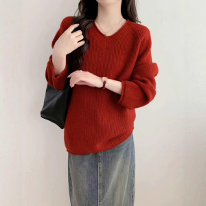 新款气质卷边V领套头毛衣女秋冬新款简约百搭宽松软糯针织衫上衣