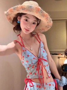 新款泳衣少女樱桃吊带四件套保守分体泳衣女比基尼小清新水上乐园