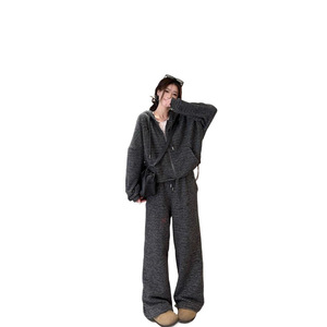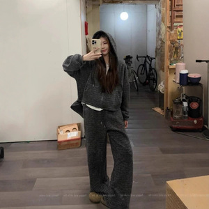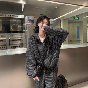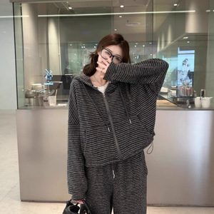 新款秋冬慵懒风套装宽松连帽条纹外套女秋冬直筒阔腿裤长裤两件套