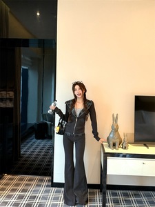 美式格纹连帽开衫卫衣拼接高腰宽松百搭卫裤阔腿裤
