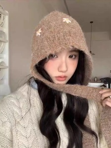 巴拉克拉法帽红色包头帽保暖防风护耳帽子围巾一体小花针织毛线帽