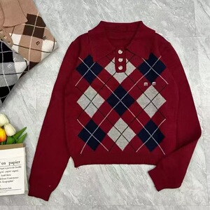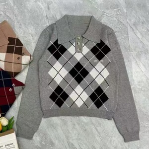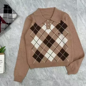 polo翻领复古菱格拼色半开襟针织衫女25秋冬百搭长袖毛衣外穿打底