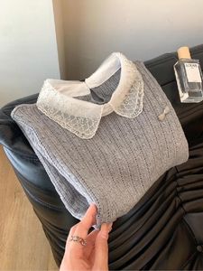 娃娃领蕾丝拼接短袖针织衫女夏季温柔风气质复古高腰短款t恤上衣