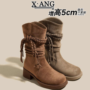废土风牛皮版粗跟骑士靴子女靴不过膝西部牛仔靴流苏堆堆靴马丁靴