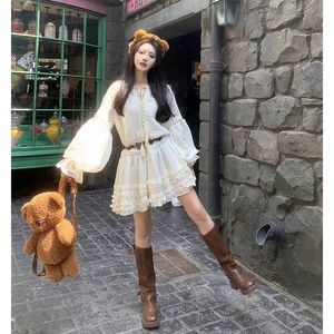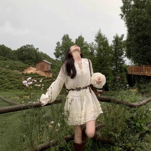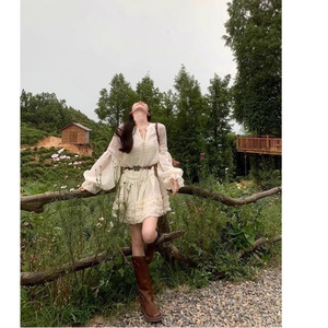 波西米亚度假风杏色灯笼袖连衣裙早秋氛围感甜美初恋系带V领短裙