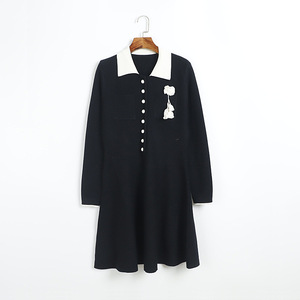 秋冬新款拼色翻领针织连衣裙优雅花朵装饰双口袋布包扣显瘦中长裙