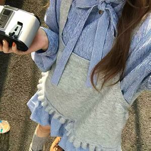 韩系复古格子蝴蝶结系带衬衫裙显瘦花苞裙女背心甜美套装秋季纽扣