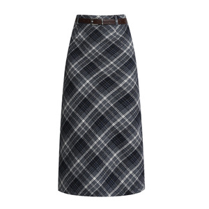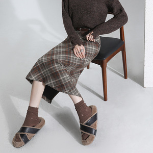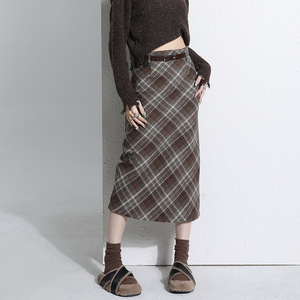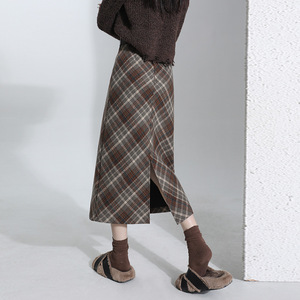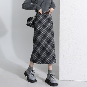 实拍毛呢格子半身裙女2025秋冬高腰A字包臀开叉格纹长裙配腰带