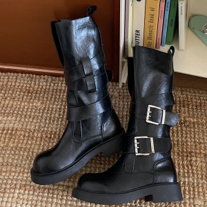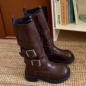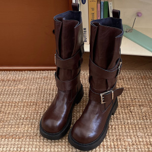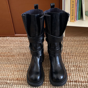 2025秋冬新款美拉德复古骑士靴女百搭厚底堆堆靴圆头皮带扣靴子女