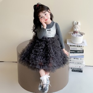 女童2025年秋款新款假两件亮片连衣裙韩版童装网红公主裙一件代发