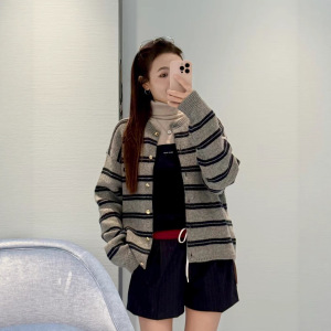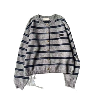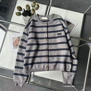 南油miu家2025秋季新款条纹针织衫外套复古学院风圆领长袖小开衫