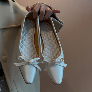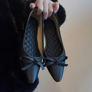 羊皮版新款平底通勤单鞋女法式蝴蝶结百搭浅口尖头一脚蹬芭蕾舞鞋