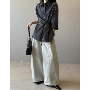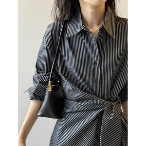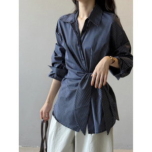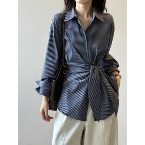 现货厂家批发 绑带条纹衬衫女 新款慵懒收腰显瘦通勤OL气质上衣