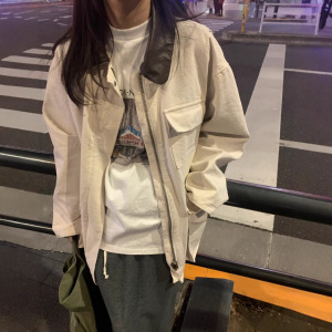 韩国chic秋装新款韩版慵懒感复古减龄撞色pu皮翻领工装风衣外套女