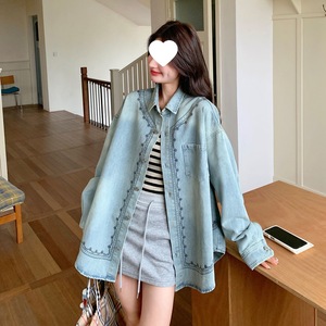 浅蓝色复古印花牛仔外套女2025秋新款设计感宽松休闲百搭衬衫上衣