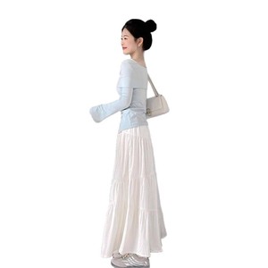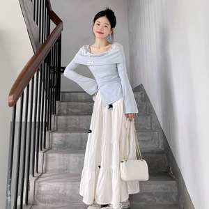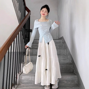 甜欲风一字肩上衣套装女早秋设计感辣妹长袖T恤高腰蝴蝶结半身裙