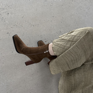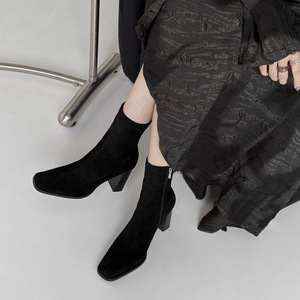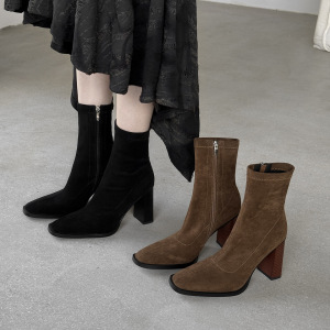 巨显瘦!绒面弹力靴女瘦瘦靴子秋冬新款方头粗高跟女式韩版短靴子