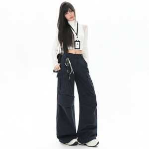藏青色美式中低腰休闲工装阔腿牛仔裤女2025秋季新款宽松直筒裤子