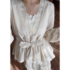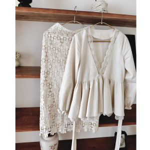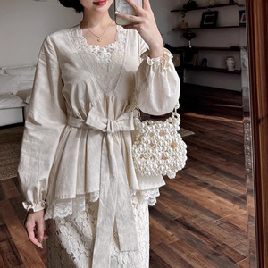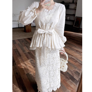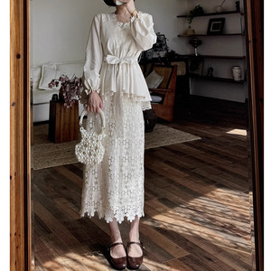 觉华莲-2025秋季新款法式V领蕾丝拼接长袖上衣蕾丝高腰半身裙套装