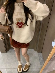 秋冬复古毛巾绣小熊套头毛衣女宽松慵懒风重磅圆领针织打底衫上衣