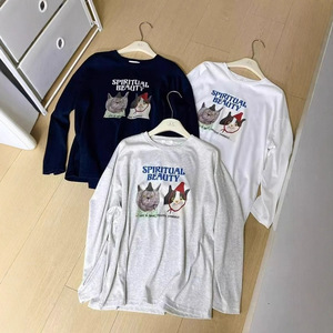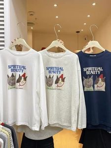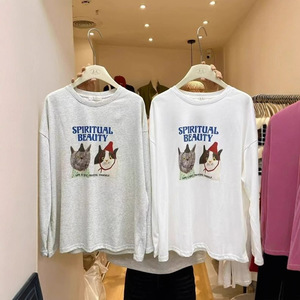复古懒慵风卡通字母印花长袖T恤女秋季新款纯棉灰色宽松显瘦上衣