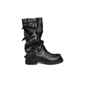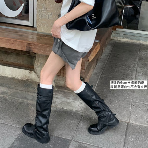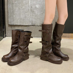 网红同款~厚底棕色美拉德中筒靴高跟皮带扣方圆头褶皱高筒骑士