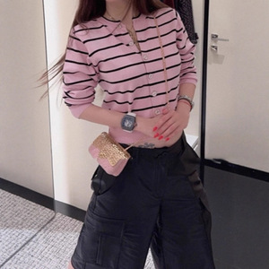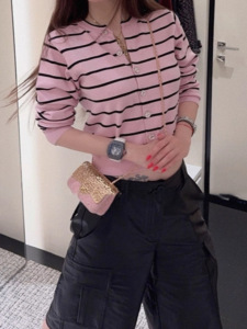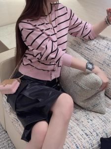 小香风粉色条纹针织开衫女春秋2025新款气质高级感显瘦毛衣短外套