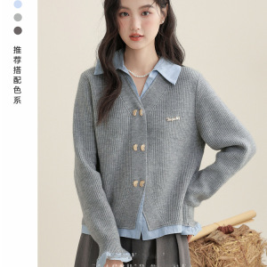 灰色假两件毛衣外套女2025春秋新款POLO领衬衫拼接针织开衫短上衣