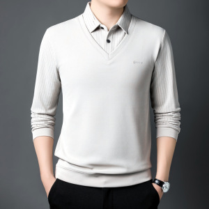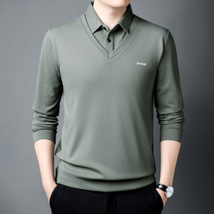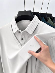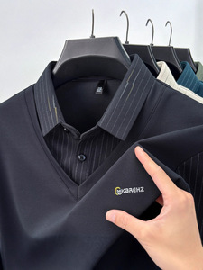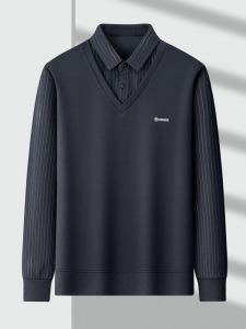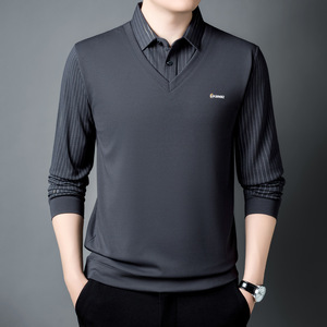 秋冬季新款假两件长袖POLO衫男士条纹衬衫领卫衣中老时尚休闲T恤
